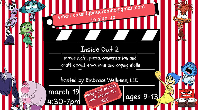 So excited to announce an upcoming event for kids age 9 to 13 years old. It will take place from 4:30pm to 7pm on Thursday, March 19th, 2026. Participants will engage in viewing of the movie Inside Out 2 and crafts related to the emotions from the movie. Discussions regarding healthy coping skills will be led by Cassidy Bauer, Clinical Psychotherapy Intern, in collaboration with Kelly Gordon, LCSW. Plus, there will be pizza and snacks!